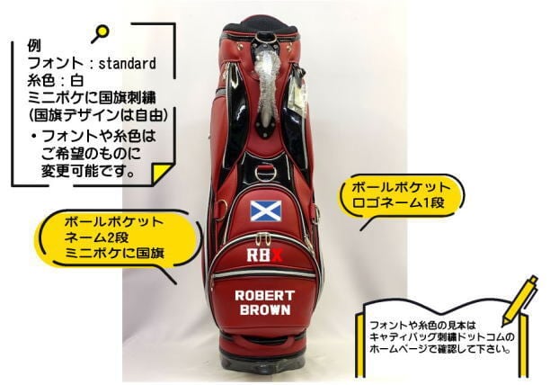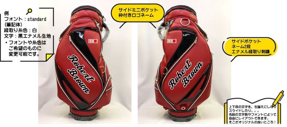 完全無地のキャディバッグに、オリジナル刺繍を施し、あなただけのオリジナルキャディバッグが購入できます。